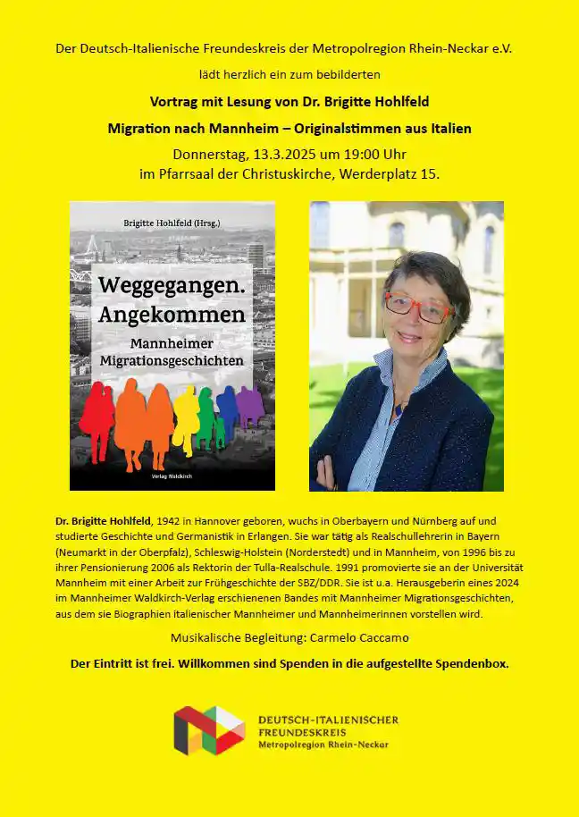 Dr. Brigitte Hohlfeld, 1942 in Hannover geboren, wuchs in Oberbayern und Nürnberg auf und studierte Geschichte und Germanistik in Erlangen. Sie war tätig als Realschullehrerin in Bayern (Neumarkt in der Oberpfalz), Schleswig-Holstein (Norderstedt) und in Mannheim, von 1996 bis zu ihrer Pensionierung 2006 als Rektorin der Tulla-Realschule. 1991 promovierte sie an der Universität Mannheim mit einer Arbeit zur Frühgeschichte der SBZ/DDR. Sie ist u.a. Herausgeberin eines 2024 im Mannheimer Waldkirch-Verlag erschienenen Bandes mit Mannheimer Migrationsgeschichten, aus dem sie Biographien italienischer Mannheimer und Mannheimerinnen vorstellen wird.